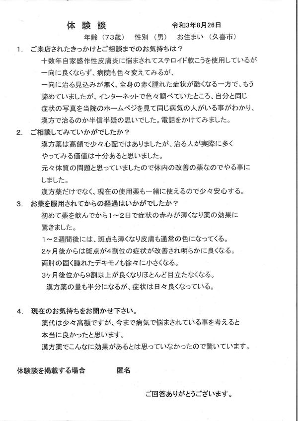ネットで自家感作性皮膚炎が治った症例を写真で見たのがきっかけで相談しました。2年近く西洋医学で治せなかったので、ここがダメならあきらめようと思っていました。