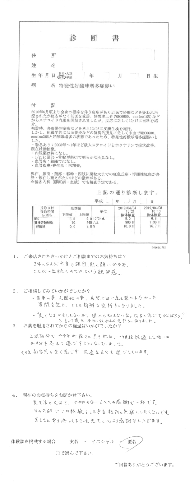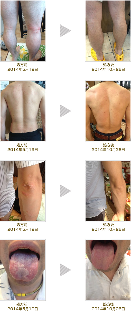 いくつもの皮膚科にもかかりましたが、ステロイドの内服薬とぬり薬を処方されるだけで なんとかステロイドだけはやめたいと、いろいろと探している中、 ネットで同じような症状の方が治ったという体験談をみつけ、漢方で治るならという思いで 伺いました。