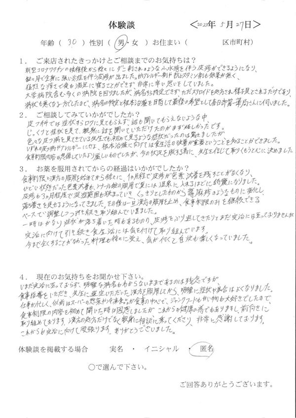 以前からポチポツとできていた湿疹が年明けから急激にひどくなり、腰や脚など汁が出てひどくかゆく、夜も眠れないのでどうにか治す方法はないかとインターネットで探していました。そして出会ったのが春日部第一薬局さんでした。出ている症例写真が自分の症状に似ていて、そういう人が治っているなら私も治るのかと希望が持てました。