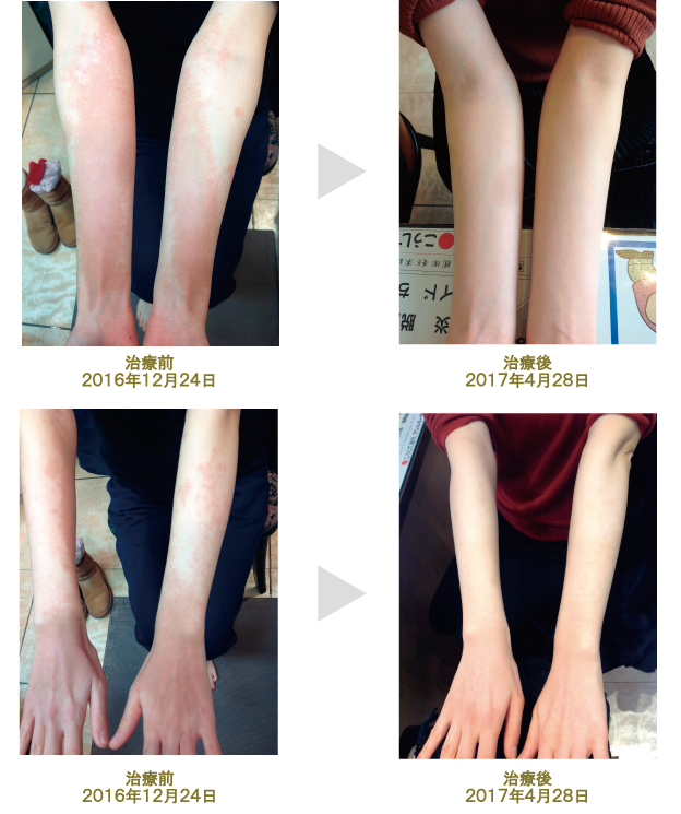 まだ完治とはいえませんが、一番ひどかった時点に比べると改善されてとても嬉しいです。 こちらに通わせていただかなかったら、今頃もまだ治らない痛がゆい、ぐじゅぐじゅの湿疹にかなり悩まされていたと思います。