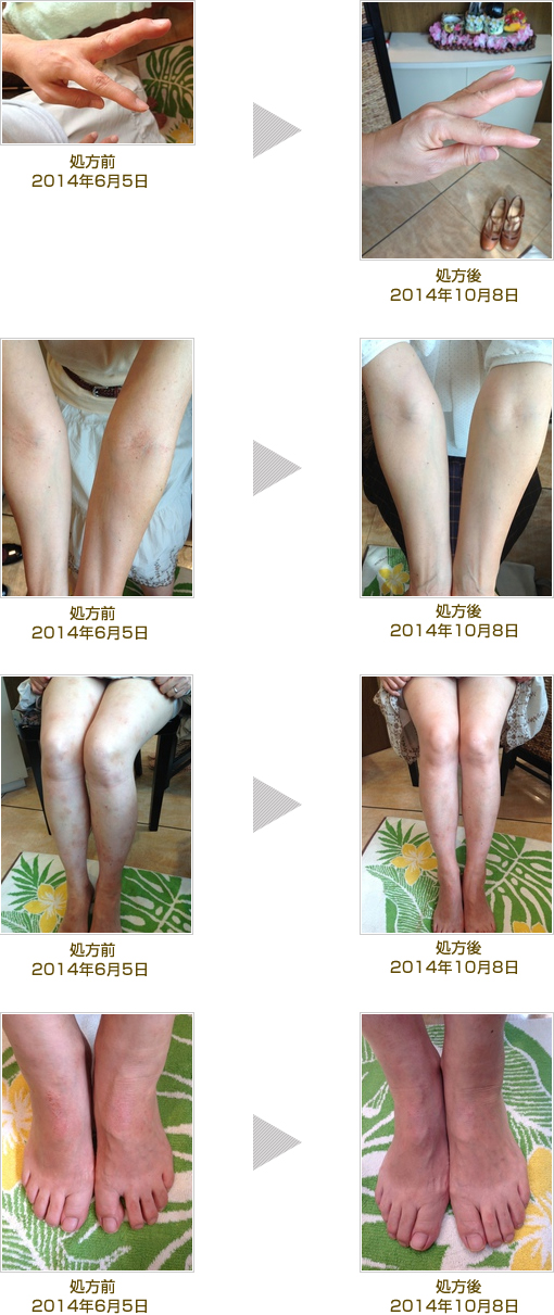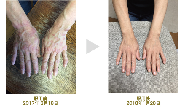 長い間、手のかゆみと湿疹に悩まされてきましたが、 今ではすっかりきれいになり、大変うれしく思っています。 これからも食生活に気を付け、家族の健康管理もしていきたいと思います。 私の場合、少々時間がかかってしまいましたが、あきらめずに続けてよかったと 思っています。