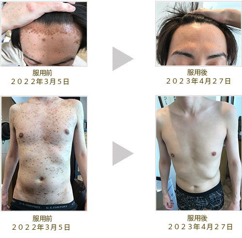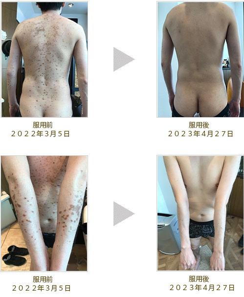 2カ月後からは斑点が4割位の症状が改善され明らかに良くなる。